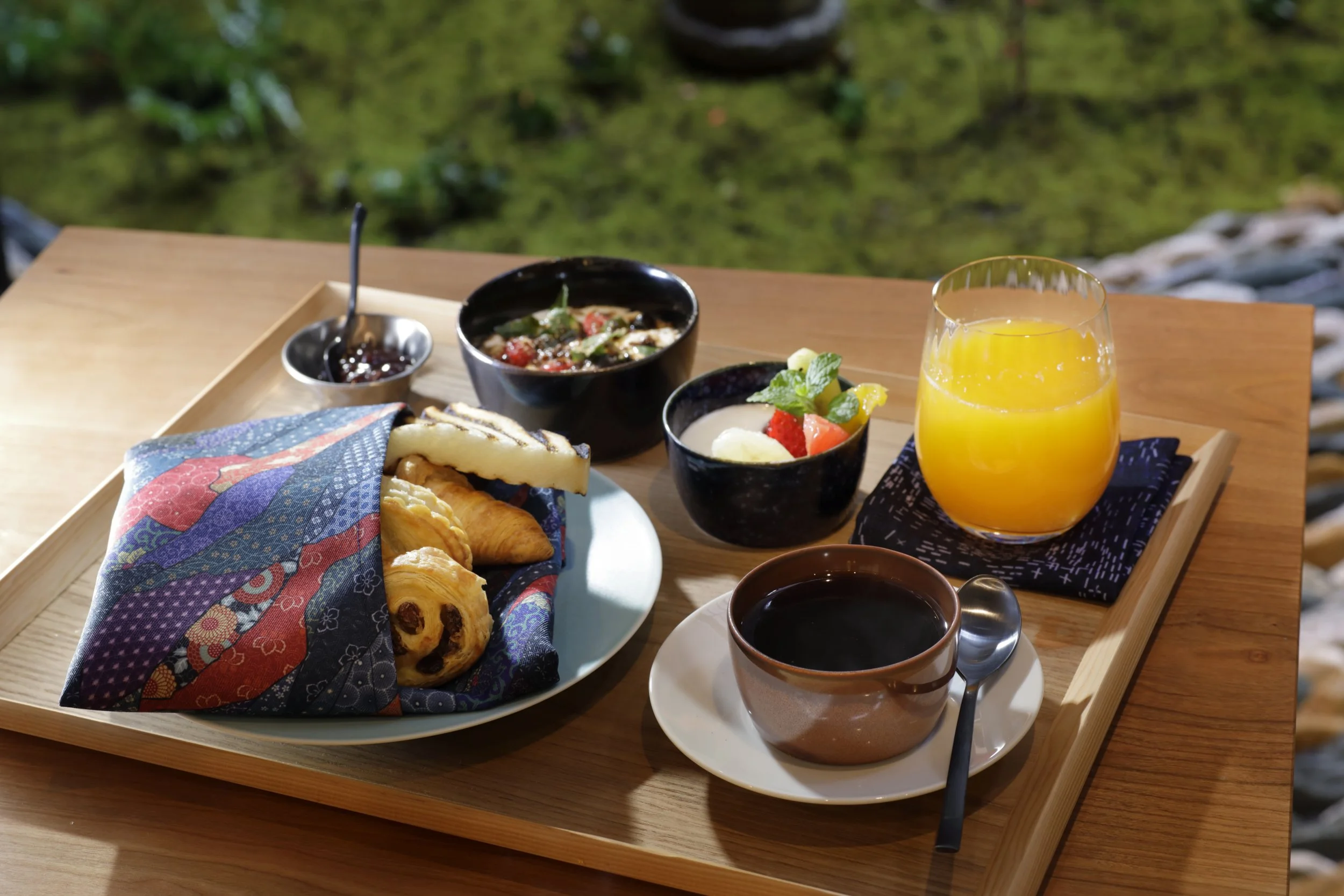 ご飲食は、お部屋に、または天候が許す場合は 5 階のスカイ・フォレスト・ガーデンにもお届けいたします。