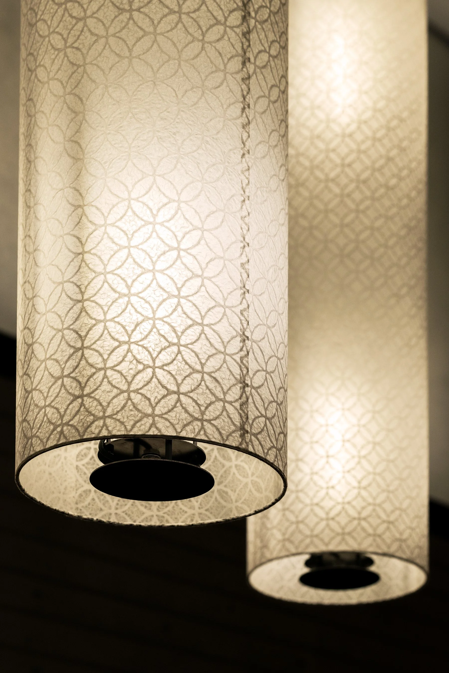 水流意象: 飯店內的天花板和紙燈箱呼應著鴨川的漣漪效果,此主題由入口處的水缽引入。